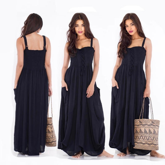 Crystal Smocked Bodice Spaghetti Strap Boho Maxi Dress