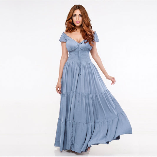 Haylee Smocked Tiers Crinkle Rayon Viking Party Maxi Dress