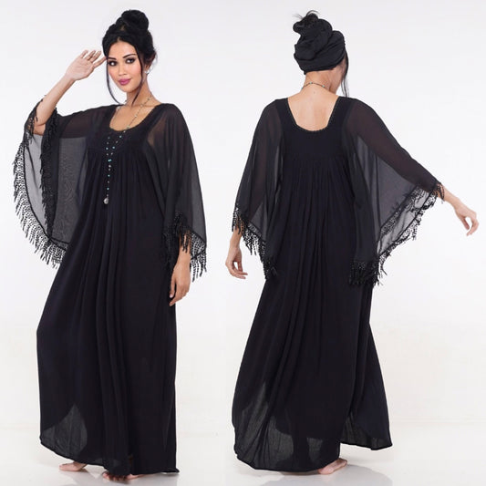 Mazikeen Fringe Butterfly Caftan Black Maxi Dress