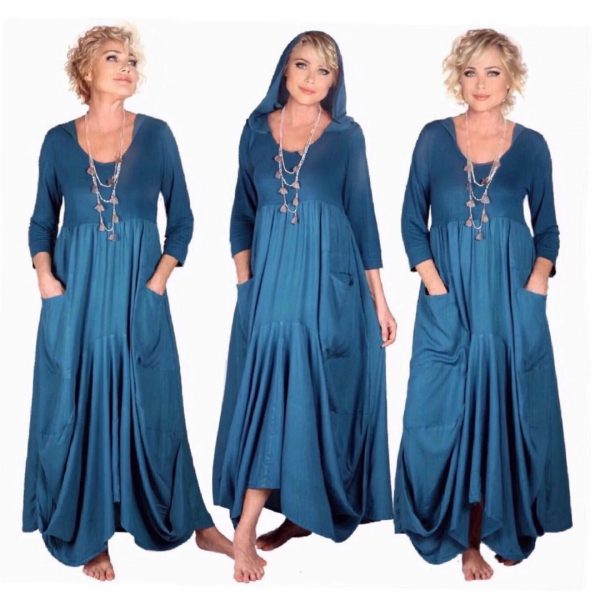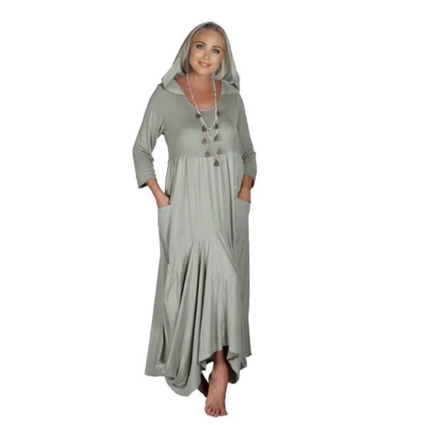 Leah Boho Maxi Dress, Hooded Dress, Stretch Jersey & Rayon, Empire Style, Asym Hem