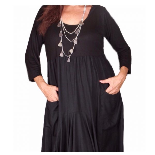 The draping hood creates a sort of Edwardian sailor collar effect at the reinforced scoop neckline. Inset sleeves are 3/4 length and the empire waistline is raised and easy-to-wear. The skirt is softly gathered and moderately full, and adorned with large and handy ‘envelope’ style pockets.